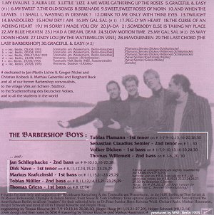 MY EVALINE AURA LEE LITTLE `LIZE WE WERE GATHERING UP THE ROSES GRACEFUL & EASY (Version 1) MY SWEET THE OLD SONGS SERENADE SWEET,SWEET ROSES OF MORN AND WHEN THE LEAVES SHALL I, WASTING IN DESPAIR ? DRINK TO ME ONLY WITH THINE EYES TWILIGHT BANDOLERO HOW DRY I AM MY GAL SAL PEG O´MY HEART THE CURSE OF AN ACHING HEART I´M SORRY I MADE YOU CRY JA-DA SOMEBODY ELSE IS TAKING MY PLACE MY BLUE HEAVEN I HAD A DREAM, DEAR SLOW MOTION TIME MY GAL SAL (Version 2) WAY DOWN HOME LINDY LOU [BY THE WATERMELON VINE] * MAVOURNEEN THE LAST CHORD [THE LAST BARBERSHOP] GRACEFUL & EASY (Version 2) |